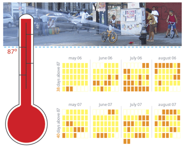 According to anecdotal DEP findings, illegal hydrant usage tends to spike when the temperatures climb into the 90’s. In 2007, the DEP began a pilot program in neighborhoods where uncappings were numerous. Hydrant Education Action Teams (H.E.A.T) made up of specially trained neighborhood teens were deployed to educate residents on the impact of uncappings. Wearing red T–shirts and armed with water bottles and fans, team members provided information to hot residents on alternatives to illegal hydrant use — from spray caps to locations of area pools and sprinklers.
