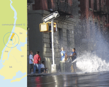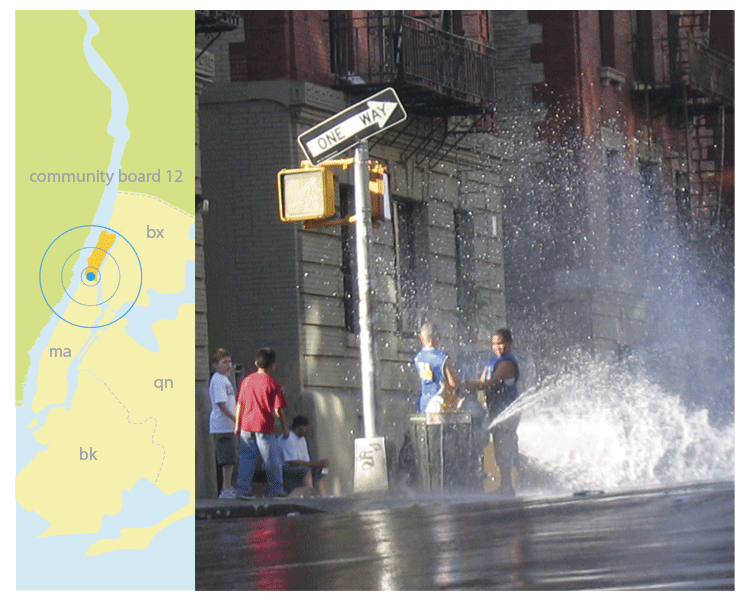 In 2006, the Times reported that a single hydrant on 157th was opened and closed fourteen times on the same day, July 21st.19 Based on this information, nyc:uncapped locates its study in the district in which the infamous hydrant resides, Community District 12.